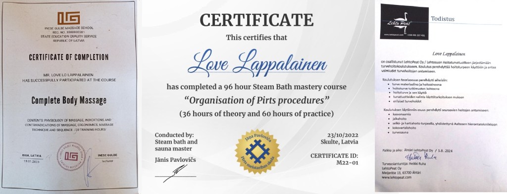 The Latvians use the word Pirtnieks for what in Finland is called Saunahoitaja (sauna nurse). The Ukrainians call the person in charge of the sauna rituals a Bansjik. Whatever he or she is called, a sauna attendant must be able to read each client and understand their issues in order to be of any use. I have built upon experience developed over generations, explored different massage techniques including peat treatment, and I graduated as Pirtnieks in Latvia 2022. Before beginning the sauna treatment, we start with getting to know one another and what to expect from the sauna. Lappalainen Sauna is an individual journey, done in close communication between the two of us.